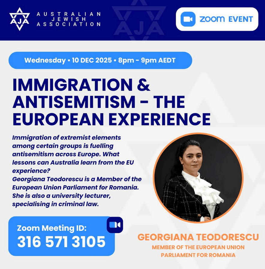 AJA Weekly Zoom will host an event on Immigration & Antisemitism - The European experience - with Georgiana Teodorescu, Member of Parliament, EU. Immigration of extremist elements among certain groups is fuelling antisemitism across Europe. What lessons can Australia learn from the EU experience? Georgiana Teodorescu is a Member of the European Union Parliament for […]